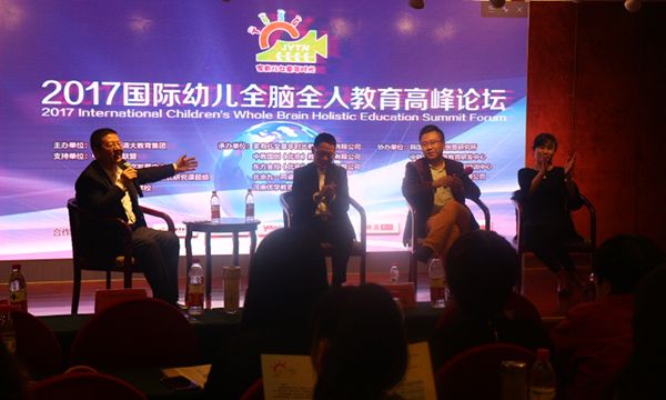 论坛在下午又进行了两项研讨,苏教授首先和国际青少儿脑力锦标赛秘书长李长城、中国教育春晚总导演王光宏、著名幼儿园园长教师培训高级讲师张春香进行了“给早教一个舞台”的研讨,探讨了全脑全人教育的广阔天地。然后,又和幼儿园品牌运营园长孟祥红、邵建华、知名教育专家康东坡进行了“快乐早教”的研讨。